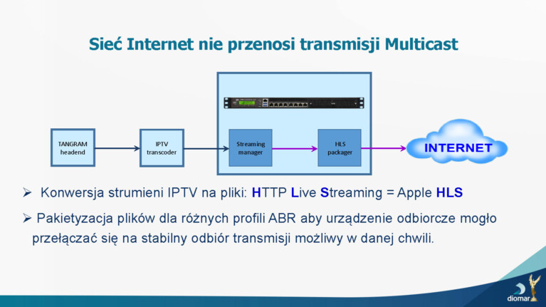 Sercem tego kompaktowego rozwiązania jest Firefly HLS IRD/Receiver, opracowany przez WISI dla alternatywnych zastosowań. Odbiera segmenty plików HLS w stacji czołowej poprzez streaming IP i konwertuje je na wyjścia QAM, DVB-T, ASI i/lub ISDB-T. Korzystając z pojedynczej obudowy Firefly, operatorzy mogą odbierać do sześciu kanałów telewizyjnych HD lub SD przesyłanych strumieniowo przez Internet, a następnie odszyfrowywać i przetwarzać je dla sieci wideo.