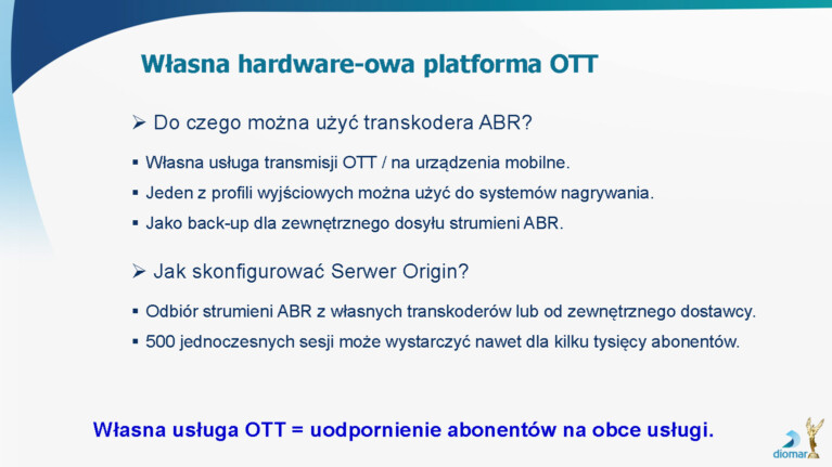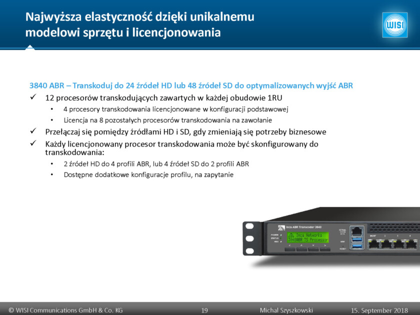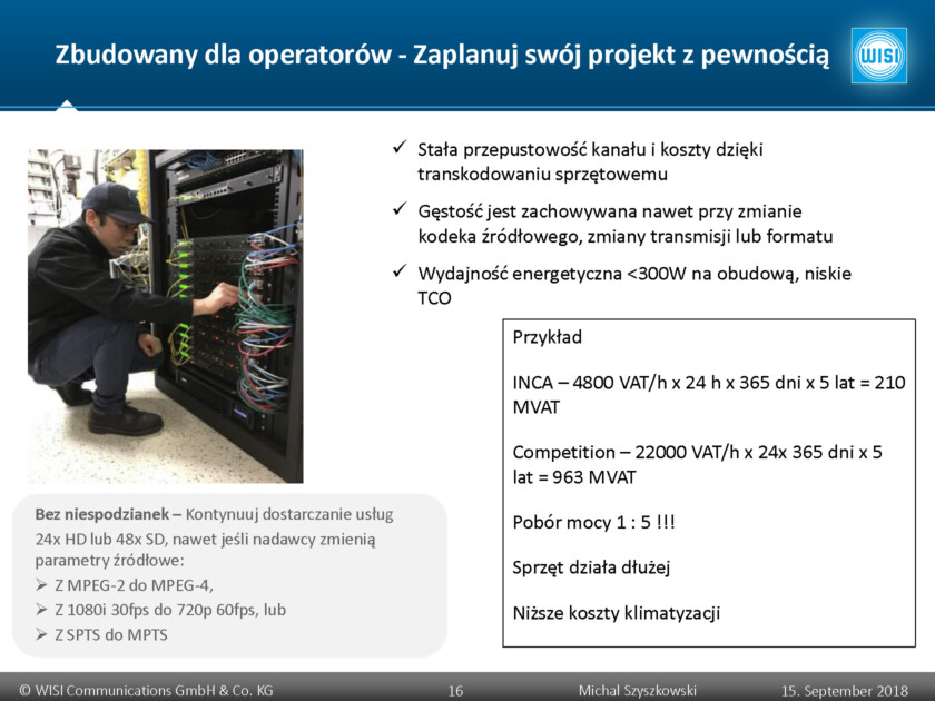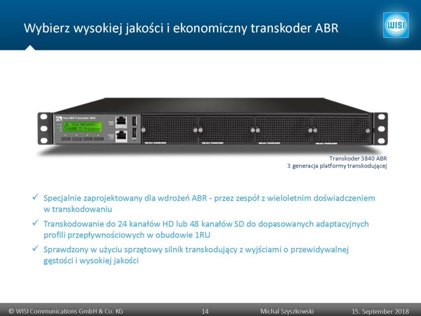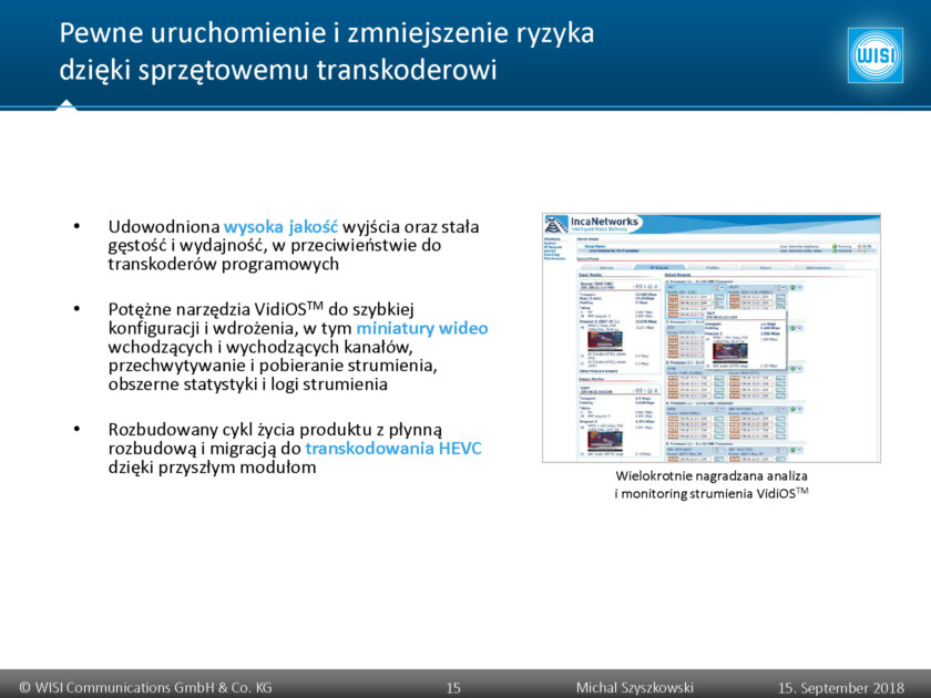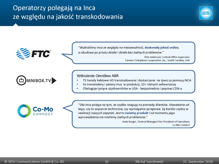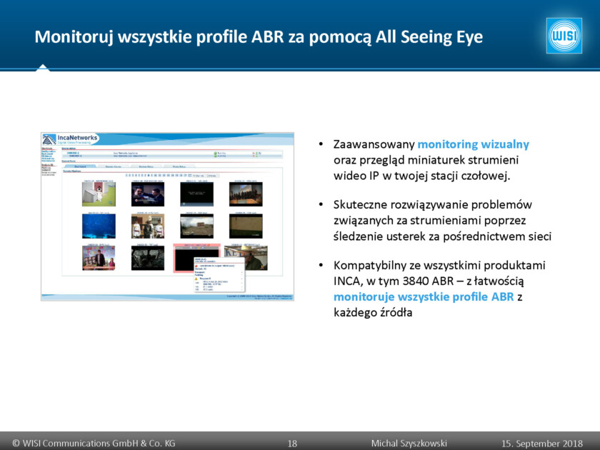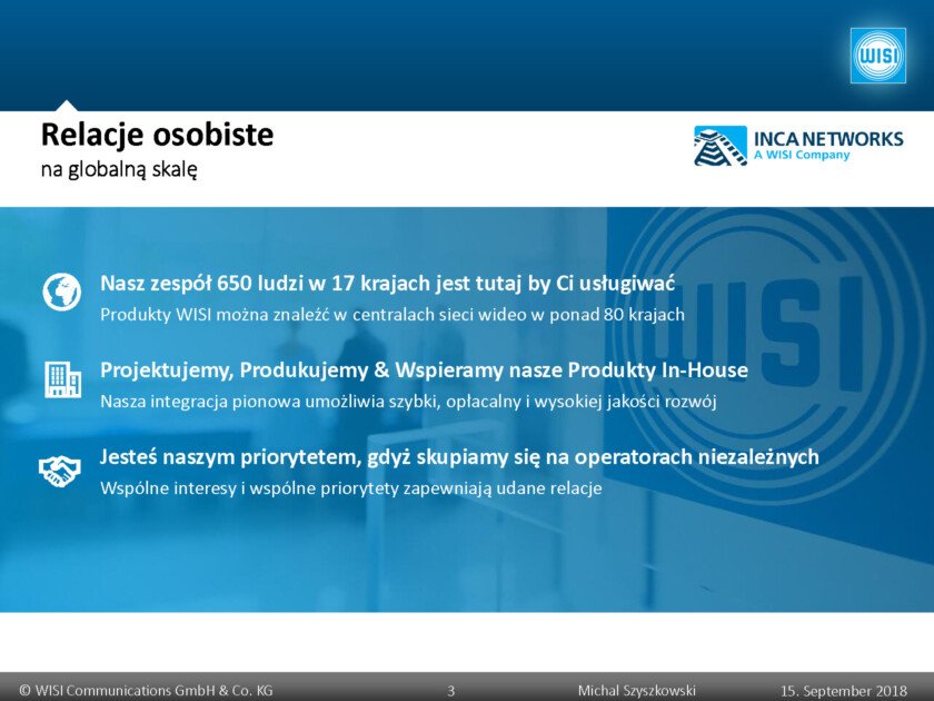WISI oferuje obszerny katalog rozwiązań klasy operatorskiej zapewniający bezpieczną dystrybucję wysokiej jakości strumieni wideo z centralnych stacji czołowych nadawców telewizyjnych i dostawców treści do dekoderów. Inca Modular Series 4400 wraz z Inca Multiscreen Packager & Origin Server 5420, mogą transkodować i pakować usługi wideo/audio i przesyłać je jako strumienie unicast HLS przez Internet do Firefly HLS IRD/Receiver. Aby zabezpieczyć dostarczanie strumienia, operatorzy mogą szyfrować strumienie u źródła i odszyfrowywać je w stacji czołowej odbierającej.