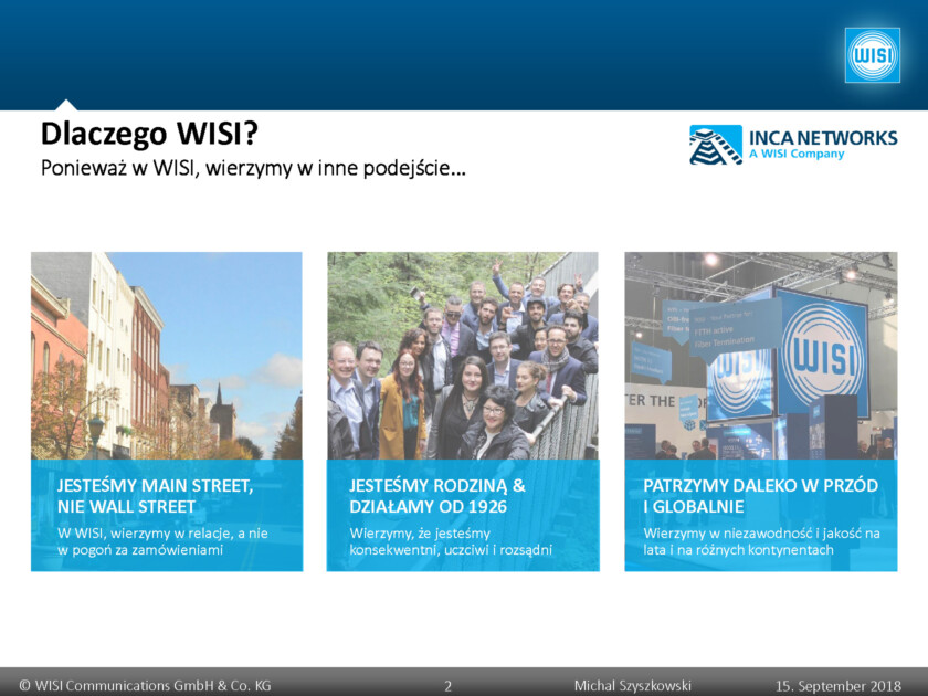 Wilhelm Sihn Jr. założył WISI w 1926 r. W Niefern-Oeschelbronn (Niemcy). Po ponad 90 latach, firma jest jednym z pionierów światowych technologii odbioru i dystrybucji szerokopasmowej. Obecnie WISI działa na całym świecie w obszarach biznesowych: komponenty do sieci szerokopasmowych, światłowody do szerokopasmowego dostępu do Internetu, odbiór sygnału cyfrowego, przetwarzanie i modulowanie dla telewizji i radia oraz multimedia wewnętrzne. WISI zatrudnia obecnie 600 osób w zakładach produkcyjnych w Niemczech, Europie, Kanadzie i Azji. Firma posiada oddziały we Francji, Austrii, Szwajcarii, Szwecji, Bułgarii, Hiszpanii, Kanadzie, Dubaju i Chinach. Ponadto WISI współpracuje z ponad 100 partnerami na głównych rynkach międzynarodowych.